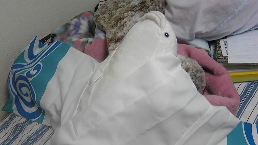 あ、写メでは鴉屋の代わりに、八●島で買った安眠枕の白イルカ君に着てもらいましたw